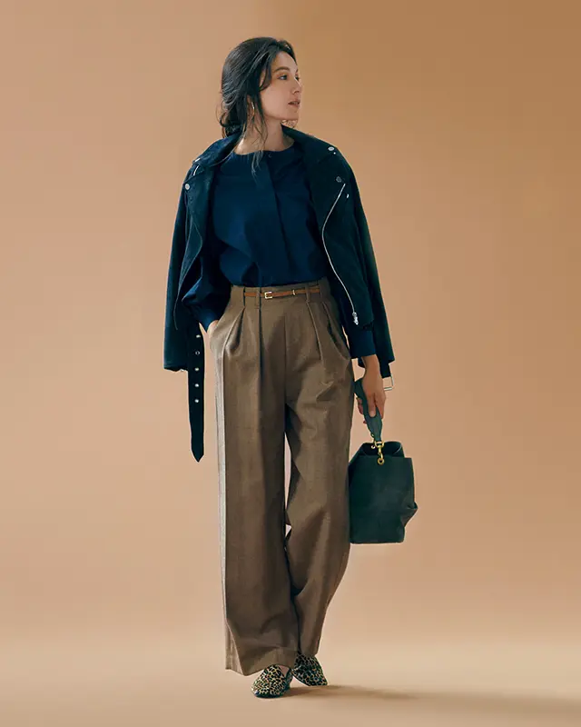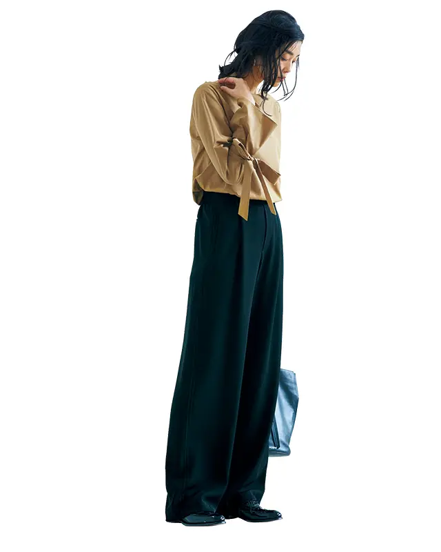 フロントタックが立体感を生み出し、おなかまわりに余裕を! ウエストまわりの端正なディテールがワイドパンツをマニッシュからきれいめな印象にシフト、優しげなムードに。トップスはシャツよりブラウスで、フェミニンさを取り入れるのがこの冬の新ルール。腰高タック入りのワイドなら脚長効果やほっそり見えも手に入る。