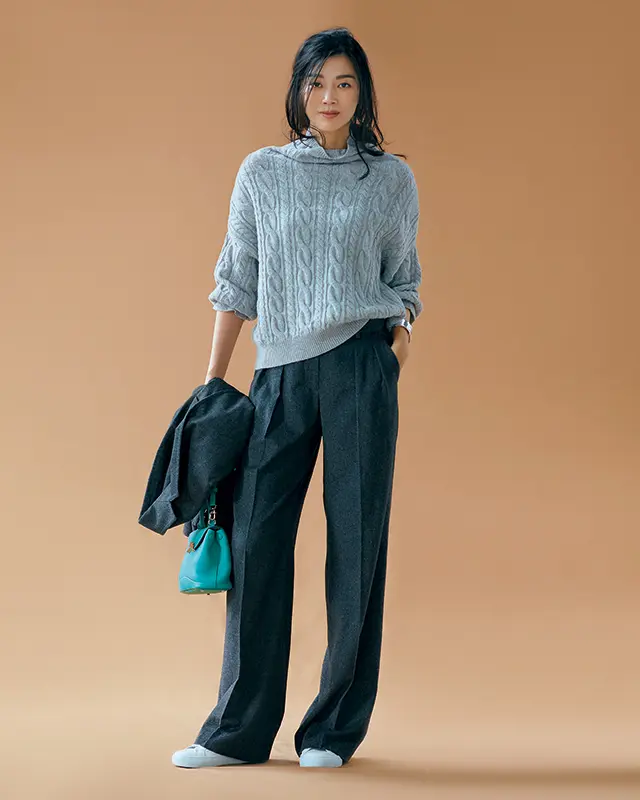 パンツ¥30,000/ebure(エブール) ジャケット¥33,000/ミューズ ドゥ ドゥーズィエム クラス 丸の内店(ドゥーズィエム クラス) ニット¥39,000/リンク・セオリー・ジャパン(セオリーリュクス) イヤリング¥14,800/セシル・エ・ジャンヌ(セシル・エ・ジャンヌ) バッグ¥359,000/ヴァレクストラ・ジャパン(ヴァレクストラ) 靴¥35,000/FUN Inc.(チェンバー)