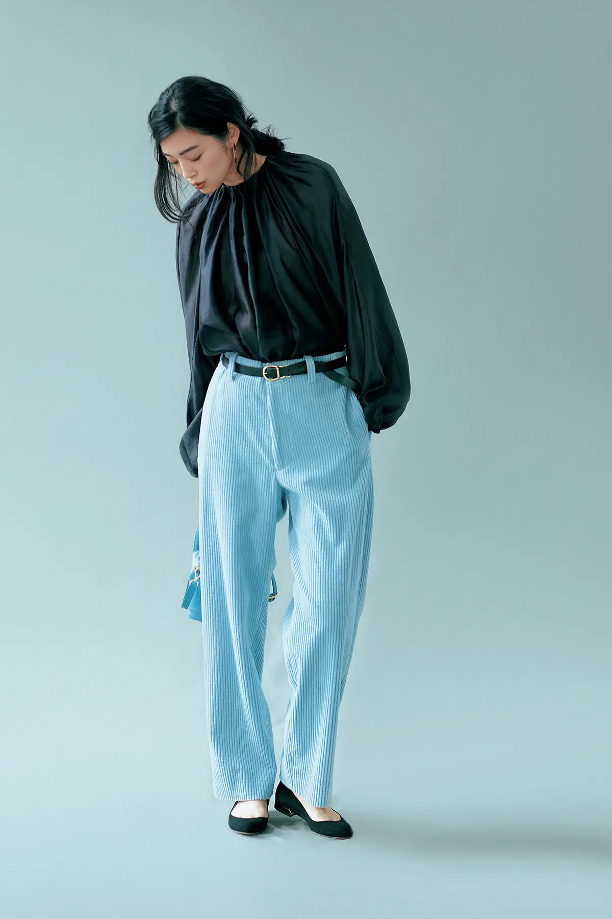 主役感たっぷりな優しげブルーで、コーデュロイのイメージを一新 ワイドからすそにかけて少し細くなったシルエットとライトブルーの優しげカラーで、太畝ながら軽やかなムードのコーデュロイパンツ。股上深めで腰まわりをほどよくカバーしてくれる、大人にはきやすいシルエットもうれしい。ギャザーをたっぷり効かせた大人のかわいげブラウスを合わせれば、ちょっと華やかなシーンもOKな洗練されたパンツスタイルが完成。