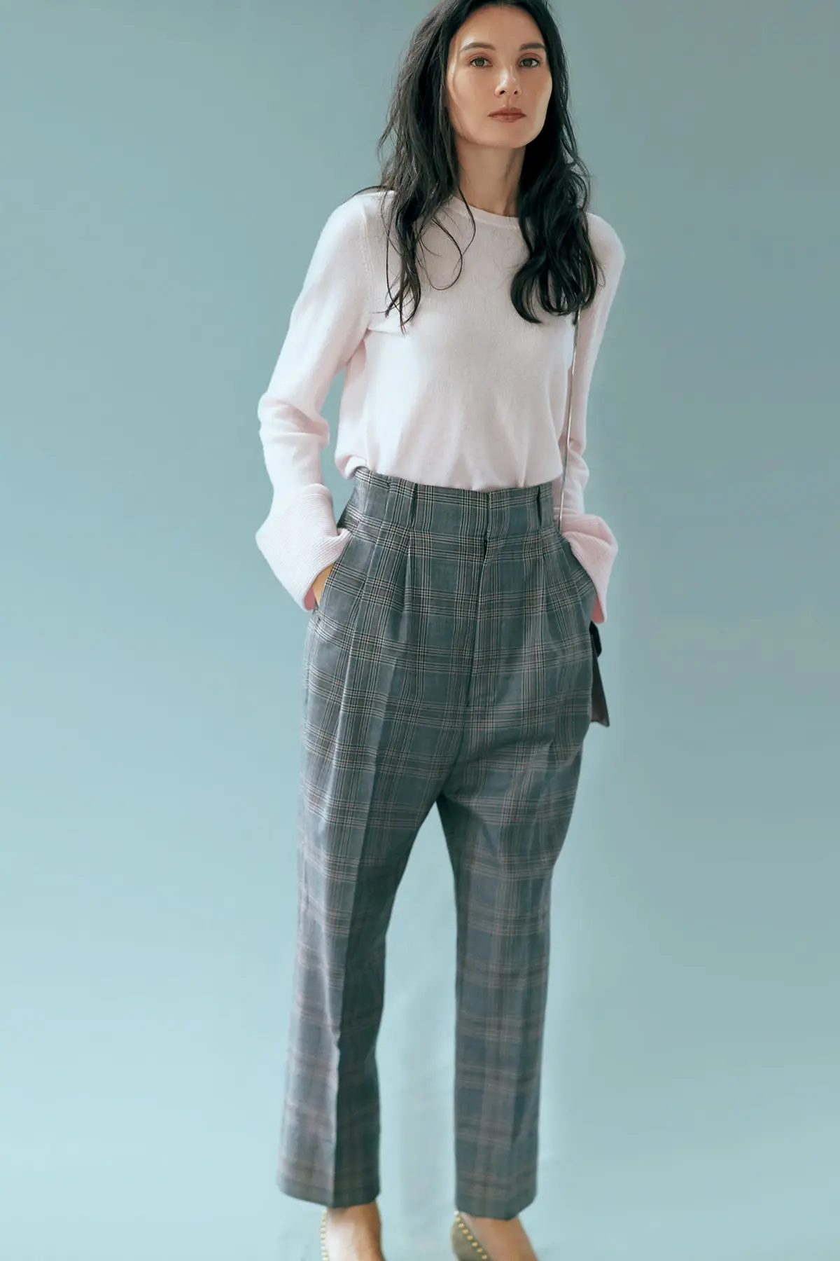ハイゲージのかわいげカラーなら、ニット合わせも洗練された印象に 袖にボリュームをもたせたフェミニンな淡いピンクのニットと、英国トラッドなグレンチェックの相反するテイストが新鮮。タックを効かせた股上が深い腰まわりのフォルムは、気になる肉感を拾わず着やせして見せてくれる優秀さ。パンツのチェックにピンクが入っていてきれい色ニットともなじみがいい。