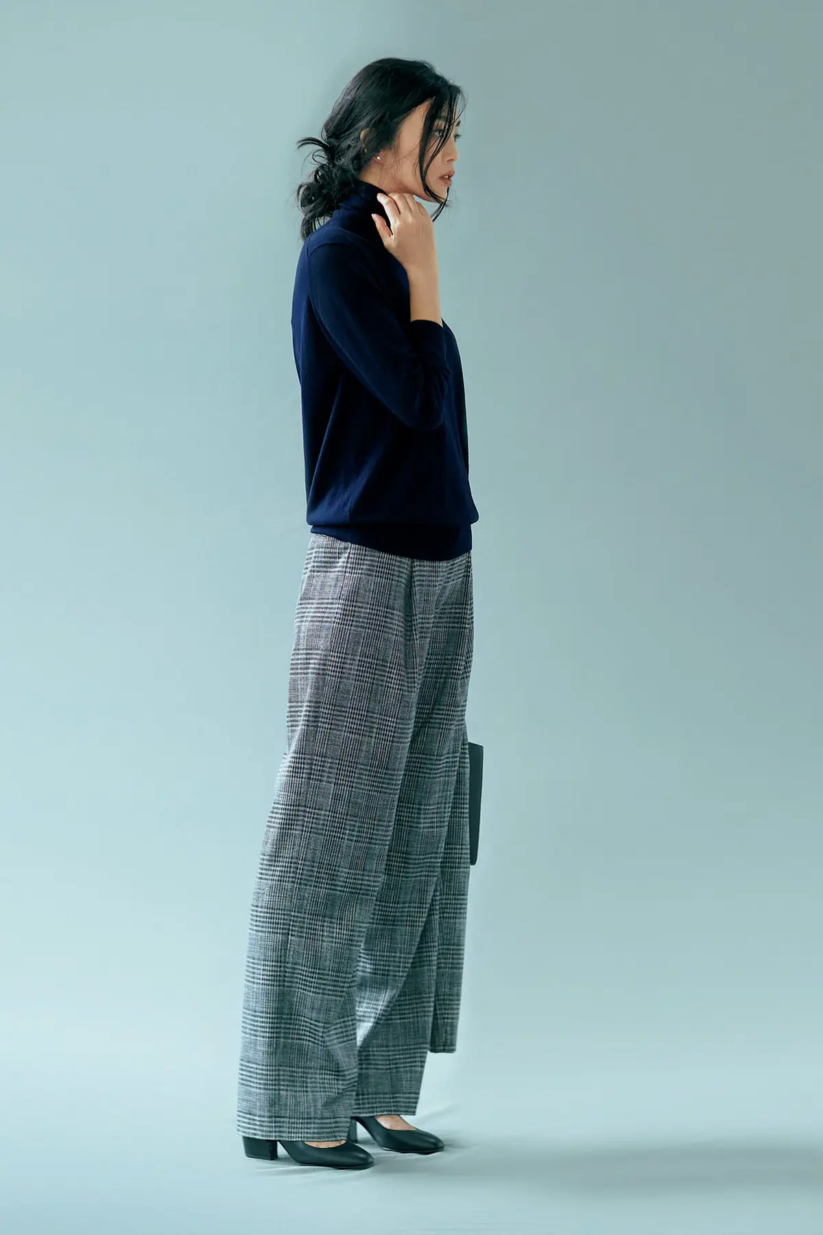 小さなパールをさりげなく。控えめな女らしさが効果的 赤いラインが入ったグレンチェックのタック入りワイドパンツは、ハイゲージのタートルニットを組み合わせたミニマルな着こなしで都会的なムードに。パールのピアスを耳もとに加えることで、上品な女らしさをさりげなく感じさせて。
