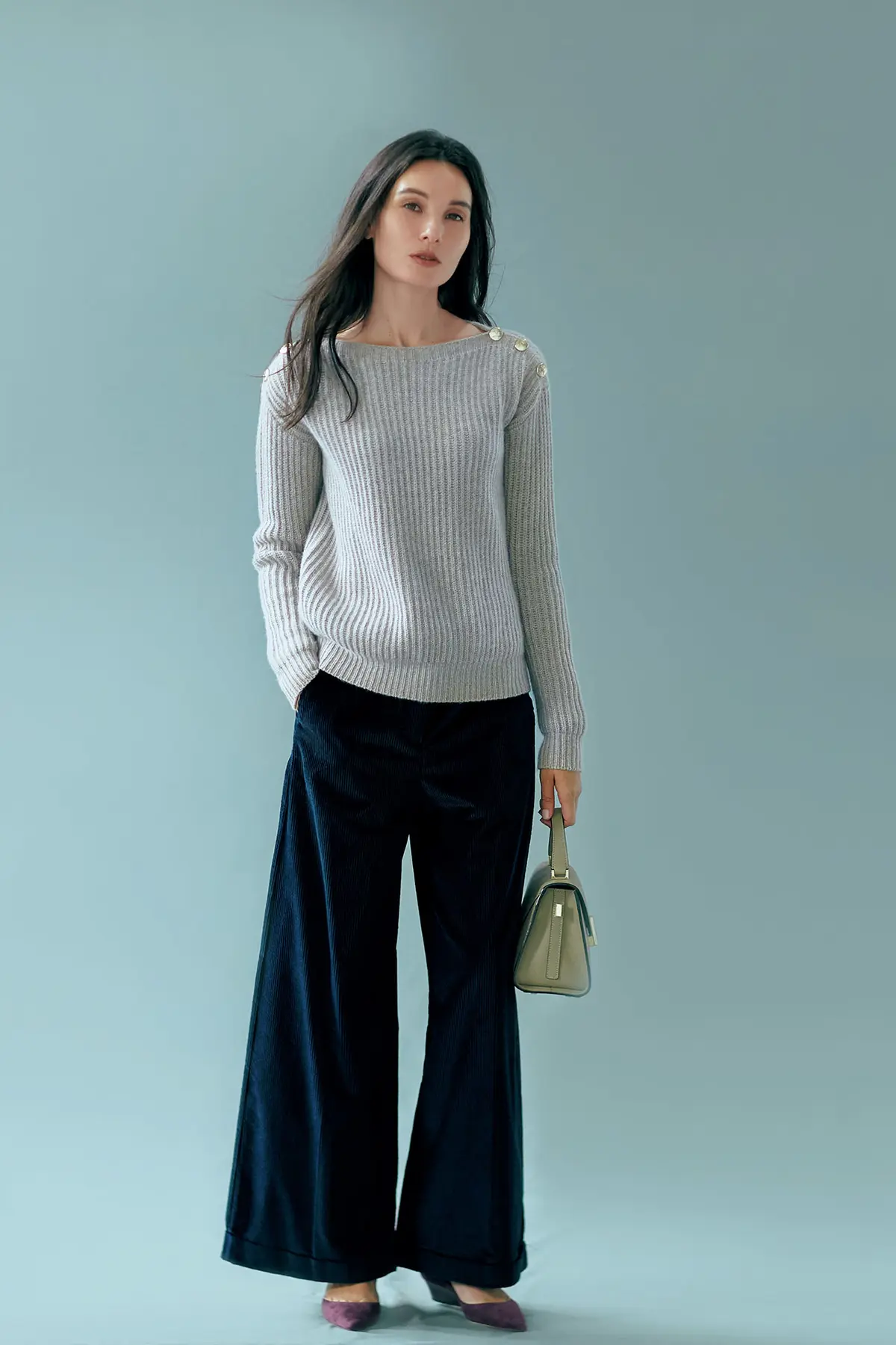 デコルテに抜け感のあるニットでほんのり女らしさをのぞかせて 定番のコットン素材のコーデュロイパンツなら、トップスにミドルゲージのニットを合わせても全体が重くなりすぎることなく好バランス。ボートネックから鎖骨をちらりと見せることで顔まわりをすっきりと、シックでしゃれたムードへ導いてくれる。シルエットがきれいなダークネイビーのワイドパンツは、合わせるトップスを選ばず着回し力も抜群。