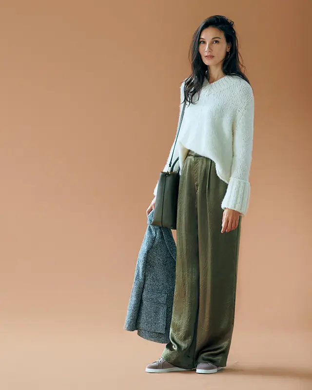 エレガントなとろみ素材と旬カラーが着こなしの鮮度をアップする アセテート100%のとろみ素材がこなれたムードに見せてくれるワイドパンツは、ほかにない絶妙なブロンズカラーで主役感たっぷり。インパクトがあるからこそ、トップスはざっくりとしたシンプルなニットでさらりと。タック入りのディテールと落ち感素材で、膨張して見えることなく力の抜けたムードがかっこいい着こなしに。
