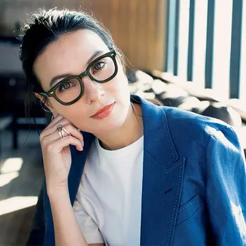 「きれいな服には抜け感を、ラフなスタイルには洗練を―、メガネが加わって、おしゃれの選択肢が広がった」と語る亜希さん。“+メガネ”でかなえる、亜希さんの新しい大人のおしゃれに注目!