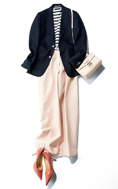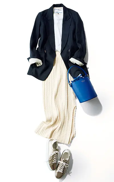 ネイビージャケットが本来もつトラッドテイストはそのままに、白いステッチをラペルに施すなど遊び心も効かせて。インに着た白いカットソーがまじめさを引き算し、ちょうどよい大人のカジュアル感を楽しめる。