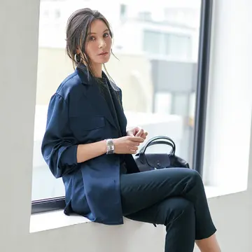 長めシャツにあえて重さのあるワイドパンツを合わせる“ロング×ロング”の最旬バランス。すっきり見えのコツは袖をたくし上げたり足の甲を見せること。