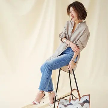 シャツとデニムの定番コーディネートも、この春はロングシャツで今どき感をアップ。ストライプ柄なら縦長の視覚効果でほっそり見えるのもうれしい。