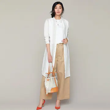 コンパクトフォルムのベーシックな白シャツを、オーガンジーのようにうっすら透ける素材で女らしさをアップ。チノパンやミリタリーパンツなどメンズライクなボトムと合わせたい。