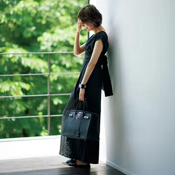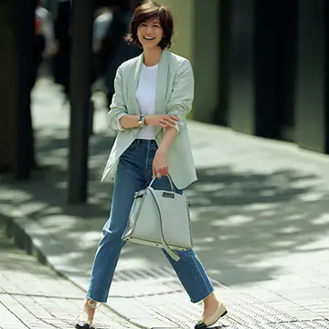 今年50歳の節目を迎えた、エクラカバーモデル・富岡佳子さんの夏の私服スタイルを大公開! 富岡さんの私服スタイルに欠かせないオールブラック。今年は肩パッド入りTシャツに挑戦して装いを刷新。
