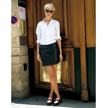 パリのシャツショップHastの白シャツにザラの黒のタイトミニスカートを合わせていたマダム。無造作なショートヘアとセリーヌのサングラスがマスキュリンな魅力を引き立てて。シンプルなのに目をひくシックな存在感は、美しい全身のバランスと、ルブタンのローファーのポイント使いにあり。手もとに効かせたゴールドのロレックスの時計とブレスレットが装いにリュクス感を添えて。