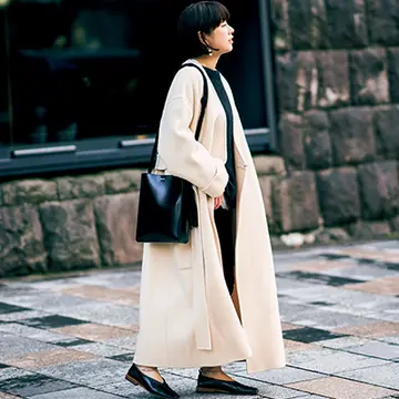 「チェックのパンツが大好きなのですが、うっかりするとほんわかしてしまうので、張りのあるハイゲージのニットで洗練させて。新作のカシミヤ100%のストールを同色使いにして、襟がわりに首を暖かに。プレスルームの近所にカフェラテを買いにいくときは、これで十分です」