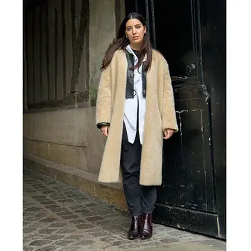ミラノマダム好みのキャメル×白の配色にチェーンバッグを斜めがけ。マダムが新しくパリで購入したのがネオングリーンのニット。コートからほんの少し見えるだけでアクティブかつ明るいイメージに。
