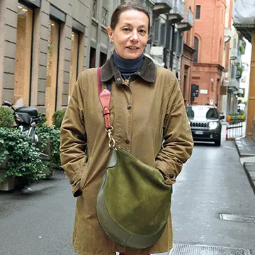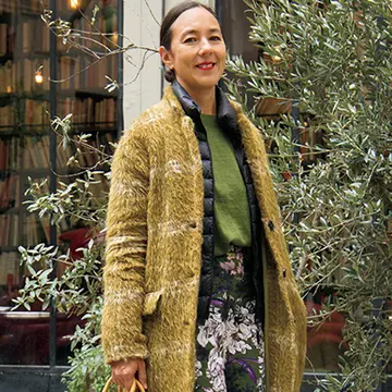 グレーがかったミルクホワイトは冬にこそおしゃれに見える。ロロ・ピアーナのニットのセットアップにスポーツマックスのジャケットをオン。くつろぎつつも大人の迫力をプラスするサングラスは、ミラノマダムの常套手段。