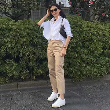 (中右)ウエストよりも高めに巻いたベルトが脚長に見せてくれる。オープンカラーで初夏気分をいち早く。