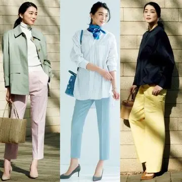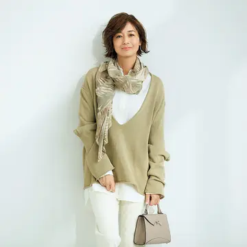 スタイリストの望月律子さんが、体型をカバーしながら着こなしをぐっと洗練させる今どきのテクニックを伝授! 望月さん曰く、新鮮着やせ色には「カーキ」がぴったりとのこと。ベージュに似た柔らかさがありながら、黒に近い引き締め効果も期待できる、今季アラフィー必見のカラーです。