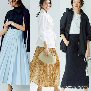 「ツヤがあって動くたびに揺れるカーキのプリーツが、下半身をスマートに」。