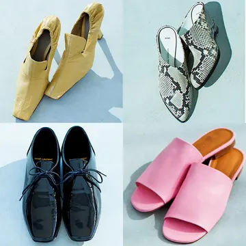 マニッシュスタイルに合うスクエアトゥ。足をキレイに見せてくれるVカットデザイン。
