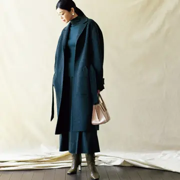 定番としてつくり続けられるダッフルは、ジャパニーズ トラッドを提案するブランドのアイデンティティ的存在。今季は二重織りでふっくら感のあるリサイクルウールのロング丈に仕立てた。プレス担当者は「落ち感があるので、着丈が長くても軽い着心地。アームホールにゆとりをもたせたので、厚手ニットを着た上からでもラクにはおれると展示会でも好評でした」という。大きめで立体的なフードと高い位置のトグルが視線を上げる役目を担い、バランスも良好。ベーシックの心地よさと女性らしさが漂う、大人のダッフルコートと呼びたい。
