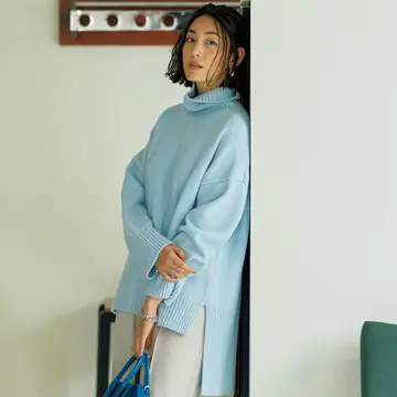 半分に折らずともあごギリギリの高さで自立する、適度に厚みのあるネックラインをチョイスすると首が長くすっきり見える。また編み目の向きで縦ラインを強調するものなら、ボリューミーなニットをシャープに見せてくれる。ニットの着丈はパンツにインすることで上半身をコンパクトに、脚長効果もプラスして。