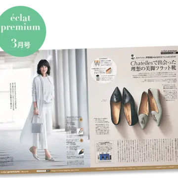 おしゃれ心に響く小粋なたたずまいと、パリの石畳を一日中歩きまわっても疲れにくいという高い機能性で、デビュー以来パリマダムを魅了しつづけているパリ発の靴ブランド『シャテル』。そのシャテルとエクラプレミアムのコラボが実現!「フラットでも大人の足を美しく見せてくれるから」と、今回スタイリストの戸野塚さんが選んだのは、辛口のポインテッドトゥ。上品で肌なじみがいいスエードのグレージュと、シックにつやめくメタリックのダークグレーの2色をセレクト。外反母趾などの足の悩みにも優しく、おしゃれ心もちゃんと後押ししてくれる。「あったらいいな」をかなえた才色兼備なフラット靴にぜひ注目して!
