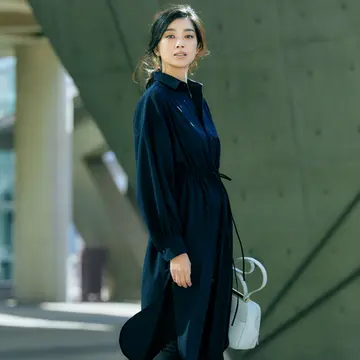 膝下からすそにかけてほんのり広がったシルエットと前後差のあるすそのカットがこなれ感たっぷり。ヒップを覆うゆったりしたビッグシャツに、ブラックスキニーを合わせるコーディネートは着やせの黄金バランス。