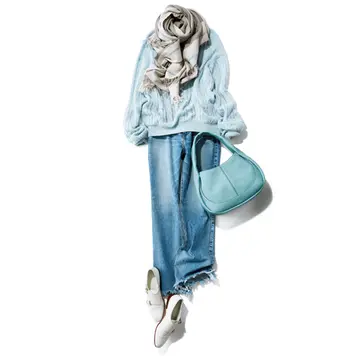デニム「インサイダークロップステップフレイ」¥29,000/サザビーリーグ(マザー) シャツ¥38,000/カオス横浜(カオス) ストール¥42,000/アッシュ・ペー・フランス(ジェーン・カー) バッグ¥49,000/ザ ストア バイシー 代官山店(メゾン ボワネ) 靴¥32,000/ファビオ ルスコーニ ルミネ有楽町店(ファビオ ルスコーニ)