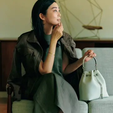 日射しに映える明るいブルーのミニバッグで、柔らかなトーンの装いを上品に引き締めて。