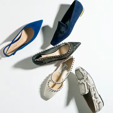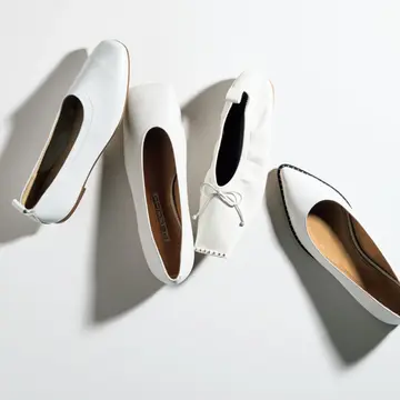 (右)ポインテッドトゥで大人顔に仕上がったバレエシューズ。光のもとでよりきらめくグリッターがひときわ華やいだ雰囲気に。