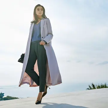 濃色ワイドパンツを軽やかに見せるコートの柔らかな表情