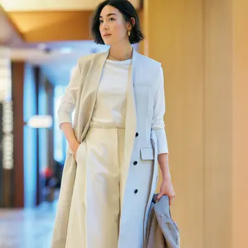 くすみ感を孕(はら)んだグリーンはアイボリーやオフホワイトとの相性が抜群。こんなあいまいな色合わせなら、全身の印象もぐっとこなれる。
