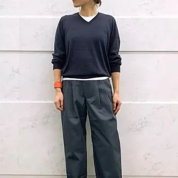 ブラウスは「オスカルさま風のブラウスが欲しくて(笑)」(地曳さん)。形状記憶タフタなので襟を立てても決まりやすい。着丈は、裾を出してもバランスよく着られる丈に設定。さらに前後差をつけたのでロングスカートにもデニムにも合わせやすい。