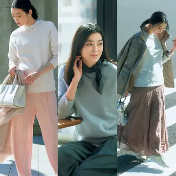 大人もシーンレスに着られる万能トップスに進化した「スウェット」。大人に似合う一枚を選んだら、次は着こなしでひと工夫。控えめなスタンドカラーが特徴的なロエフのスウェットは、首もとにスカーフをのぞかせて。