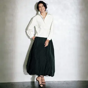 (右)腰まわりはすっきりと、途中から幅広プリーツでゆるやかに広がって。ハイウエストにあしらったベルトで脚長効果も。リネン100%だから春から夏に向けて黒でも軽やかな印象をキープ。スカート¥46,200/モールド(チノ)