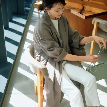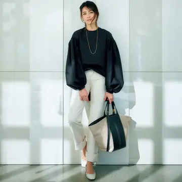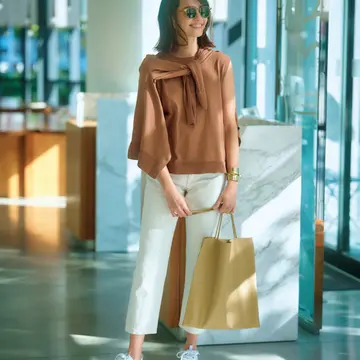 「白ボトムは膨張して見えそう」と心配なら、細めのテーパードシルエットに挑戦してほしい。脚のラインを拾わない絶妙なゆとりとすそにかけて細くなる美脚ラインがスタイルアップに効果的。