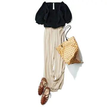 ニット¥53,900/エイトン青山(エイトン) パンツ¥39,600/ロンハーマン(トゥルー ロイヤル) バングル¥25,300/ズットホリック(パズ コレクティブ) 時計¥1,111,000/オメガお客様センター(オメガ) バッグ¥39,600/コロネット(ミラ・ショーン) 靴¥105,600/ジャンヴィト ロッシ ジャパン(ジャンヴィト ロッシ)
