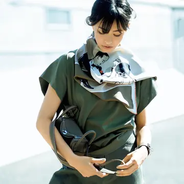 「職人技が生み出す完璧な一枚。スカーフはやっぱりエルメス!」と語るのはマダム戸野塚ことスタイリストの戸野塚かおるさん。マルタン・マルジェラによって発案された菱形スカーフの新作で、おしゃれに新しい息吹を吹き込む今どきな巻き方をレクチャー。