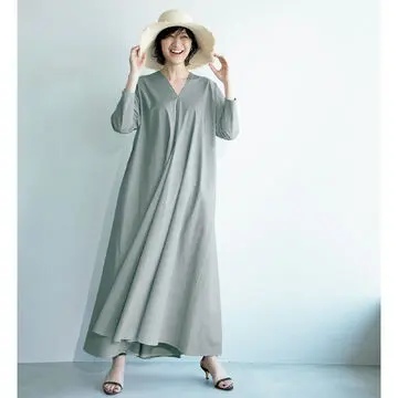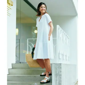 ほんのりとしたツヤ感があるレーヨン混のコットンニットを採用することで、カジュアルすぎない仕上がりに。鮮度の高さと同時に、二の腕やヒップをカバーする実用性の高さも◎。