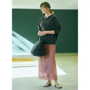 レース素材のナロースカートに、シンプルなTストラップのトングサンダルが絶妙なコンビネーション。素肌感多めのリラクシーな足もとがブラックコーデを軽やかに見せる。