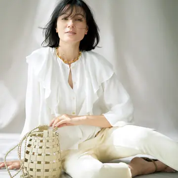 ブラウス¥55,000/サザビーリーグ(マーレット) ジャケット¥72,600・パンツ¥41,800/イレーヴ ブレスレット¥13,200/ビームス ハウス 丸の内(フィリップ オーディベール) バッグ¥64,900/ピエール アルディ 東京(ピエール アルディ)