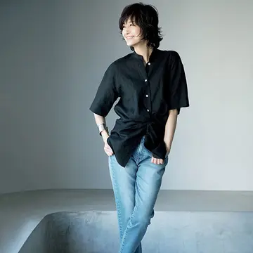 「背中のVのあきが目を引く、バックスタイルが印象的なドレスです。程よいストレッチ感のある素材で、袖をクシュっとたくしあげても窮屈さがありません。しわになりにくい素材なので、ちょっと贅沢な日常着として活躍してくれそうです。」(バイヤーT)