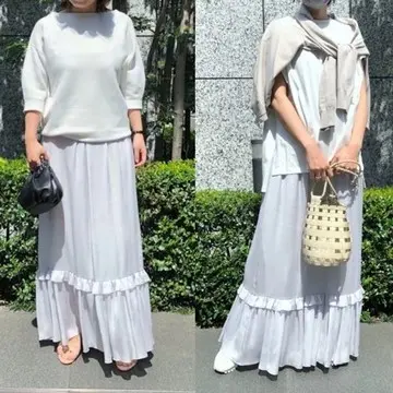 éclat5月号掲載の人気アイテム「ATON」ドレープドレス。エクラプレミアムで150cm台の小柄バイヤーとしておなじみバイヤーMと、160cm台のバイヤーTで着比べてみました。着丈&シルエットの参考にしてみてくださいね。