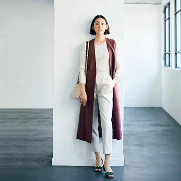 その結果行きついたのが、着こなしのどこかに「直線」や「斜め線」といったまっすぐなラインを意識的につくることでした。例えば、近ごろ人気のロングジレ。これはただ着るだけで、肩から膝下にかけての「直線」が簡単に引けてしまう頼もしいアイテム。また、ゆるっとしたトップスをウエストやわきに軽く入れて、すそのラインで「斜め線」をつくることでもたちまちスッキリ見え。そんな目の錯覚を利用すると、ちょっとしたテクニックで全身のバランスがよくなり、グッと着やせ効果を感じられるようになります。