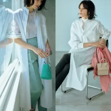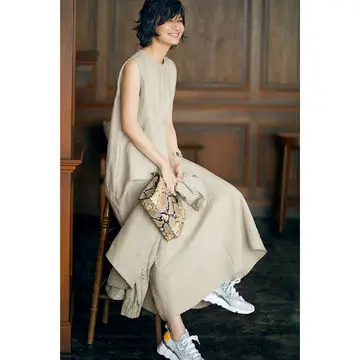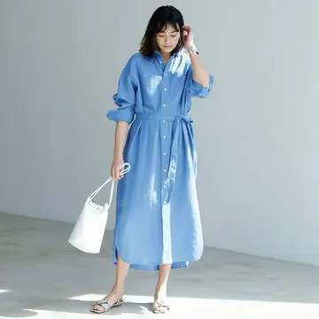 大人におすすめなのは、着るだけで簡単に旬のアレンジを楽しめるシャツワンピース。ノースリーブのシャツワンピースは、ニットを肩がけしたり、下に重ねてジレ風に着たりとアレンジ自在。ロング丈&ストライプ柄を選んでスマート見えをかなえて。