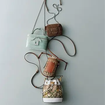 アクセサリー感覚で身につける極小バッグが人気急上昇。ボディにクロスする斜め線は細く長めに!が今年流。