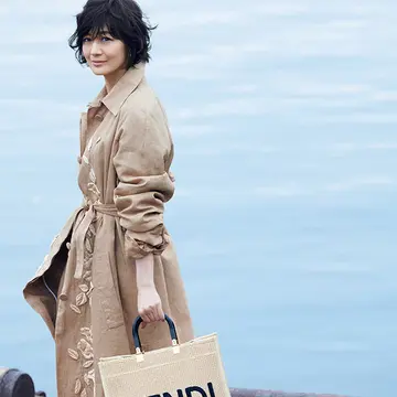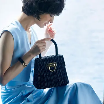 ハンドルだけでなく、サイドやオーバル型の底面、ショルダーストラップもレザー。レザーを多く使っているから、柔らかなラフィア素材のかごバッグでもシェイプがきちんとして、持ちやすい。コニャック色のレザーは使い込んだような雰囲気が漂い、こなれた味わいに。ほどよいサイズ感も魅力。ショルダーストラップは取りはずし可能。