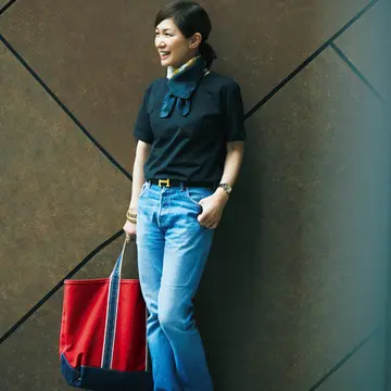 全身デニムのようなカジュアルなコーディネートも、甘さのあるリネンのトップスできれいな印象に。(すべて根岸さん私物)