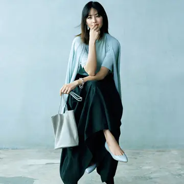 スカート¥30,800/カオス丸の内(カオス) ニット¥26,400/ギャルリー・ヴィー 丸の内店(ギャルリー・ヴィー) ジャケット¥64,900/イレーヴ ネックレス¥22,000/ショールーム セッション(マリハ) バングル¥50,600/アパルトモン 青山店(ティリー スヴェアーズ) バッグ¥204,600/トッズ・ジャパン(トッズ) 靴¥49,500/トゥモローランド(ブレンタ)