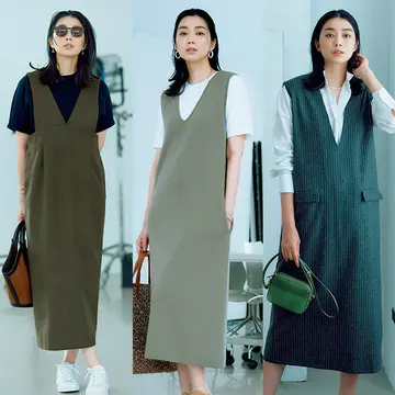 ジャンパースカートは合わせるトップスしだいで印象も、季節感もチェンジできるのがいいところ。一枚のスカートの着回しで、そのバリエーションが実感できる!