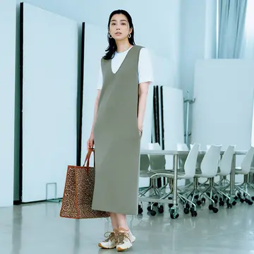 ボウブラウスとの組み合わせで、女らしい初秋の装いに。トップスの身頃を覆うジャンパースカートは、ゆったりと優雅なレイヤード効果を生んでくれるのも魅力。上品さに今どきのリラックス感をプラスでき、ちょっとした外出にぴったりのおしゃれモードに。カーキ+ブラウンの秋色でしっとりとまとめて。