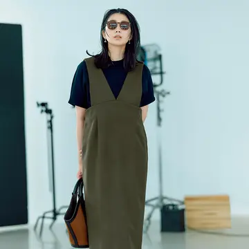 ジャンパースカート¥59,400/アナイ カットソー¥12,100/インターブリッジ(マジェスティック フィラチュール) サングラス¥42,900/プロポデザイン(プロポ) ピアス¥36,300/ショールーム セッション(マリハ) リング¥31,500/プリュイ トウキョウ(プリュイ) バッグ ¥83,600/ピエール アルディ 東京(ピエール アルディ) 靴¥102,300/トッズ・ジャパン(トッズ)